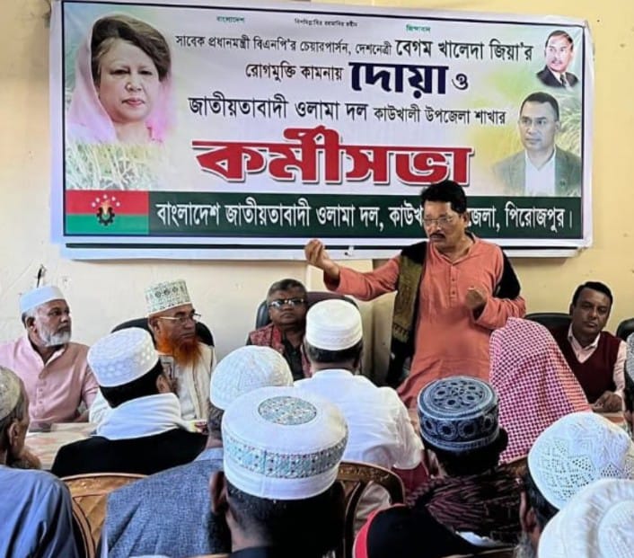 পিরোজপুরের কাউখালীতে সাবেক প্রধানমন্ত্রী ও বিএনপি'র চেয়ারপার্সন বেগম খালেদা জিয়ার রোগ মুক্তি কামনায় দোয়া অনুষ্ঠানের আয়োজন করেন, বাংলাদেশ জাতীয়তাবাদী ওলামা দল,কাউখালী উপজেলা শাখার নেতৃবৃন্দ। ২৮ নভেম্বর(শুক্রবার)সকাল ১১ ঘটিকার সময় উপজেলা বিএনপির অফিস কার্যালয়ে, মাওলানা মোঃ সরোয়ার হোসেনের সভাপতিত্বে উক্ত অনুষ্ঠানে প্রধান অতিথি হিসেবে উপস্থিত ছিলেন কাউখালী উপজেলা বিএনপির সভাপতি ও সাবেক উপজেলা চেয়ারম্যান এস.এম.আহসান কবির,বিশেষ অতিথি হিসেবে উপস্থিত ছিলেন উপজেলা বিএনপির সাধারণ সম্পাদক এইচ.এম.দ্বীন মোহাম্মদ,জেলা ওলামা দলের আহ্বায়ক অধ্যক্ষ মাওলানা দেলোয়ার হোসেন তালুকদার, উপজেলা বিএনপির সিনিয়র সহ-সভাপতি মনিরুজ্জামান মিঞা,সিনিয়র যুগ্ম সাধারণ সম্পাদক জিয়াউল হাসান নিক্সন,বিএনপি নেতা শাহ ইমরান ফারুক,গিয়াস উদ্দিন ওলি সহ দলটির অন্যান্য সহযোগী সংগঠনের বিভিন্ন নেতাকর্মীবৃন্দ। উক্ত অনুষ্ঠানে আলোচনার এক পর্যায়ে কাউখালী উপজেলা ওলামাদলের নব গঠিত আহ্বায়ক কমিটি ঘোষণা করেন,জেলা ওলামা দলের আহ্বায়ক অধ্যক্ষ মাওলানা দেলোয়ার হোসেন তালুকদার। উক্ত কমিটিতে হাফেজ মাওলানা যুবায়ের হোসেনকে আহ্বায়ক, মাওলানা মুফতি মোঃ নুরুল হুদাকে সিনিয়র যুগ্ম আহ্বায়ক এবং হাফেজ মাওলানা মোঃ বনি আমিনকে সদস্য সচিব সহ ৩১ সদস্য বিশিষ্ট কমিটি গঠন করা হয়। এ সময় দোয়া অনুষ্ঠান পরিচালনা করেন কাউখালী ইমাম মুয়াজ্জিন সমবায় সমিতির সভাপতি হাফেজ মাওলানা মোঃ ইবাদত হোসেন। দোয়া অনুষ্ঠানে সাবেক প্রধানমন্ত্রী ও বিএনপি'র চেয়ারপার্সন বেগম খালেদা জিয়ার রোগ মুক্তি সহ আগামী ত্রয়োদশ জাতীয় সংসদ নির্বাচনে বাংলাদেশ জাতীয়তাবাদী দল বিএনপিকে নিরঙ্কুশ সংখ্যা গরিষ্ঠতায় রাষ্ট্র ক্ষমতায় অধিষ্ঠিত করার জন্য মহান আল্লাহর কাছে সাহায্য প্রার্থনা করেন। অনুষ্ঠানটি সঞ্চালনায় ছিলেন বিএনপির সাংগঠনিক সম্পাদক মোঃ রফিকুল ইসলাম রফিক।