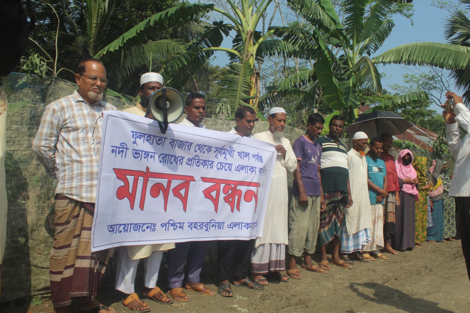 বাগেরহাটের মোরেলগঞ্জ উপজেলার বহরবুনিয়া ইউনিয়ন এলাকায় নদী ভাঙ্গনের হাত থেকে রক্ষা পাওয়ার লক্ষে এলাকাবাশির উদ্যেগে এক মানববন্ধন অনুষ্ঠিত হয়েছে। গতকাল শুক্রবার সকাল দশ টায় পশ্চিম বহরবুনিয়া গ্রামের কাটাখাল এলাকার সূর্যমোহ খালের গোড়ায় ঘর-বাড়ি, রাস্তা, ব্রীজ রক্ষার দাবিতে এ মানববন্ধন করেন এলাকাবাসী। এ মানববন্ধনে বক্তৃতা করেন সভাপতি যুব জামায়েত বহরবুনিয়া ইউনিয়ন মো. মাসুদ পারভেস, সাধারণ সম্পাদক শ্রমিক কল্যাণ ফেডারেশন বহরবুনিয়া ইউনিয়ন মো. নাজুল হক, বিএনপি সভাপতি ৩ নং ওয়ার্ড বহরবুনিয়া ইউনিয়ন মো. এনায়েত হাওলাদার, সুপার ফজলুল করিম দাখিল মাদ্রাসা ফুলহাতা মাওলানা আ. হান্নান, সাবেক ইউপি সদস্য বহরবুনিয়া ইউনিয়ন মো. মোশাররফ হাওলাদার প্রমুখ। মানববন্ধনে বক্তারা বলেন, ইতমধ্যে নদী ভাঙ্গনের ফলে কয়েক শত বাড়ি-ঘর নদীতে বিলিন হয়েগেছে। হাজার হাজার মানুষ মাথা গোজার ঠাই হারিয়ে এলাকা ছেড়ে শহরে চলে গেছেন। মানববন্ধনে শতাধিক নারী-পুরুষ অংশগ্রহণ করেন। সকলের দাবি মাননীয় প্রধানমন্ত্রীর কাছে যাতে জরুরী ভিত্তিতে নদী ভাঙ্গন প্রতিরোধের জন্য ব্যবস্থা গ্রহণ করেন। তাহা না হলে এলাকার শত শত মানুষ গৃহহারা এবং কাটা খালের উপর পাকা ব্রীজটি ধসে পড়বে। নদী গর্ভে চলেযাবে হাজার হাজার একর ফসলি জমি। যার ক্ষতি এলাকার লোক কখনোই পোষাতে পারবেন না। এলাকাবাসী আরো বলেন, বিগত দিনে বহু সরকার এসেছে কিন্তু জনগণকে আসার আলো দেখিয়পছেন, বাস্তবে তেমন কোন পদক্ষেপ গ্রহণ করেননি। আগামী বর্ষা মৌসুমির আগেই জরুরী ভিত্তিতে নদী ভাঙ্গন প্রতিরোধ চায় এলাকাবাসী।